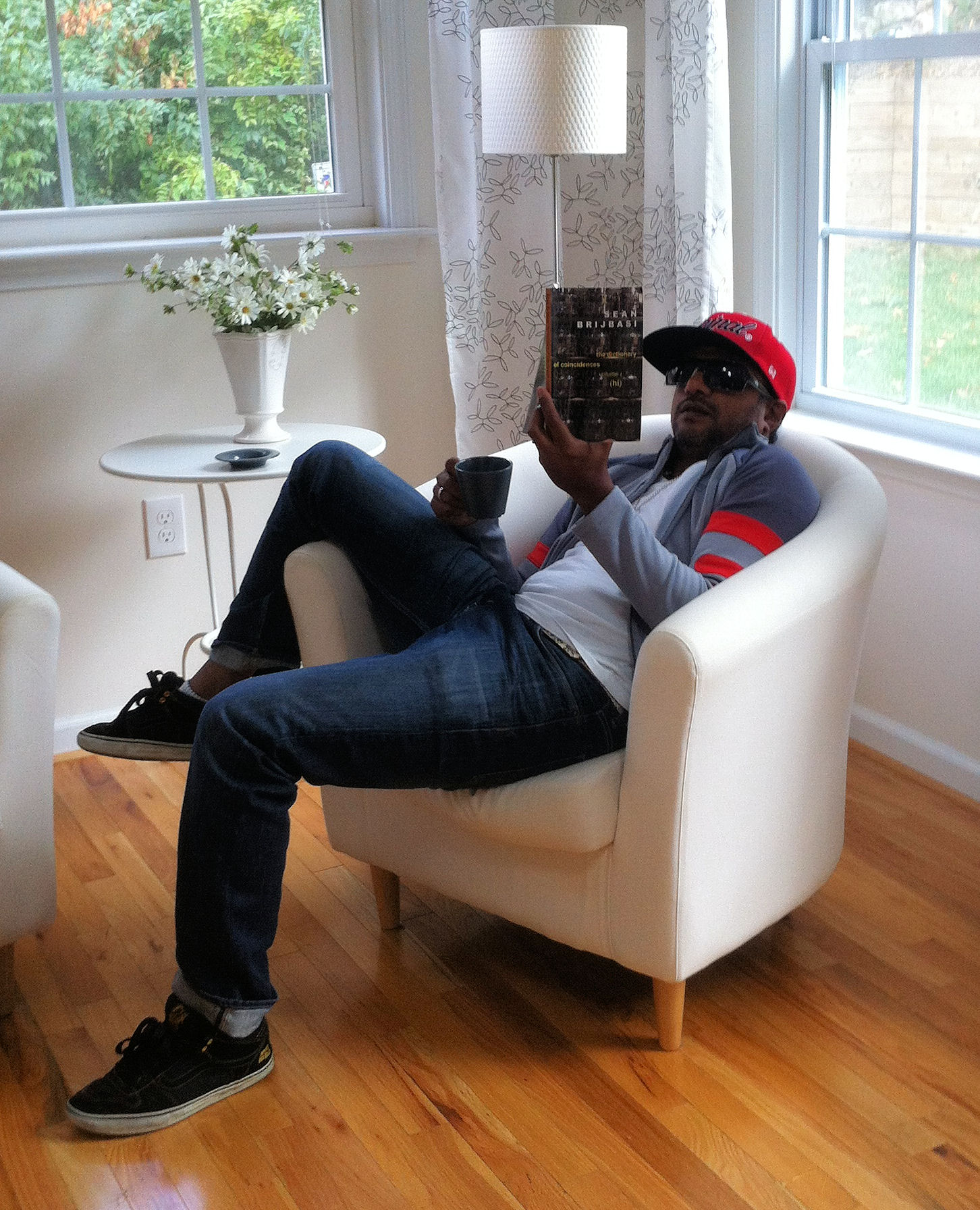 I got more comfortable and really started reading. By the time I put my leg over the chair I had whoever might be there to watch me read riveted. I looked over the book a few times and noticed that only 5 or 6 people left the café while I was reading. I know what you're thinking...putting my leg over the chair was bad form but it was for the sake of art. I was overcome by the text and just let myself go. Poetry has that kind of effect on me and I don't think I should apologize for that. I chuckled a few times while I was reading B because I remembered what a reviewer wrote about B: "utter nonsense". I bet you he wishes he was there at Café Hopeless on September 28, 2013. Too bad for him.